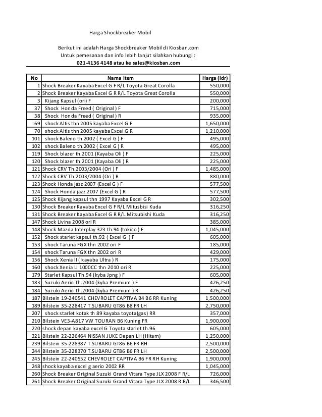 Owh yah harga shockbreaker mobil Kayaba disetiap penjual mungkin berbeda beda jadi silahkan cari yang termurah Sayangnya dipasaran banyak beredar shock mobil Kayaba palsu yang kualitasnya jauh dibawah shock original Resiko memakai shock palsu adalah membuat mobil kurang nyaman dan biasanya lebih gampang rusak